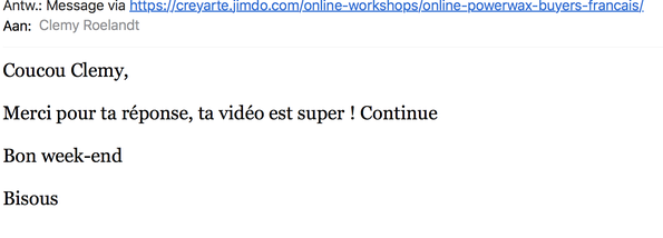 1000 mercis à vous pr votre générosité et votre partage, je regarde la vidéo des ce soir en rentrant du travail. J ai hate de souscrire à vos ateliers en ligne futurs. En attendant, je serai ravie de vous rencontrer ce 6 mars " pour de vrai " pas encore de questions pr l instant donc. Merci !!!!